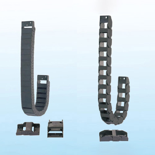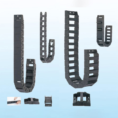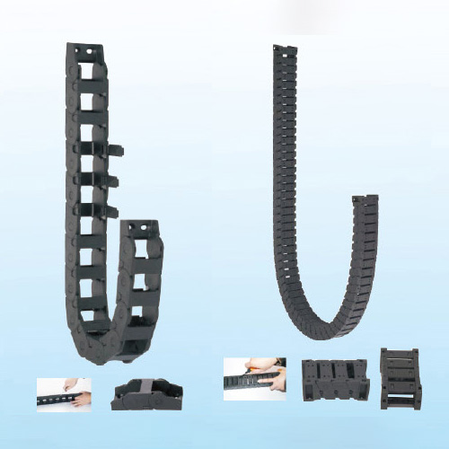 單元鏈節由左右鏈板和上下蓋板組成,拖鏈每節都能打開,裝拆方便,不必穿線,打開蓋板后即可把電纜、油管、氣管、水管等放入拖鏈。